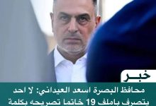 محافظ البصرة اسعد العيداني: لا احد يتصرف باملف 19 خاتما تصريحه بكلمة ” الا بأمرنا”.
