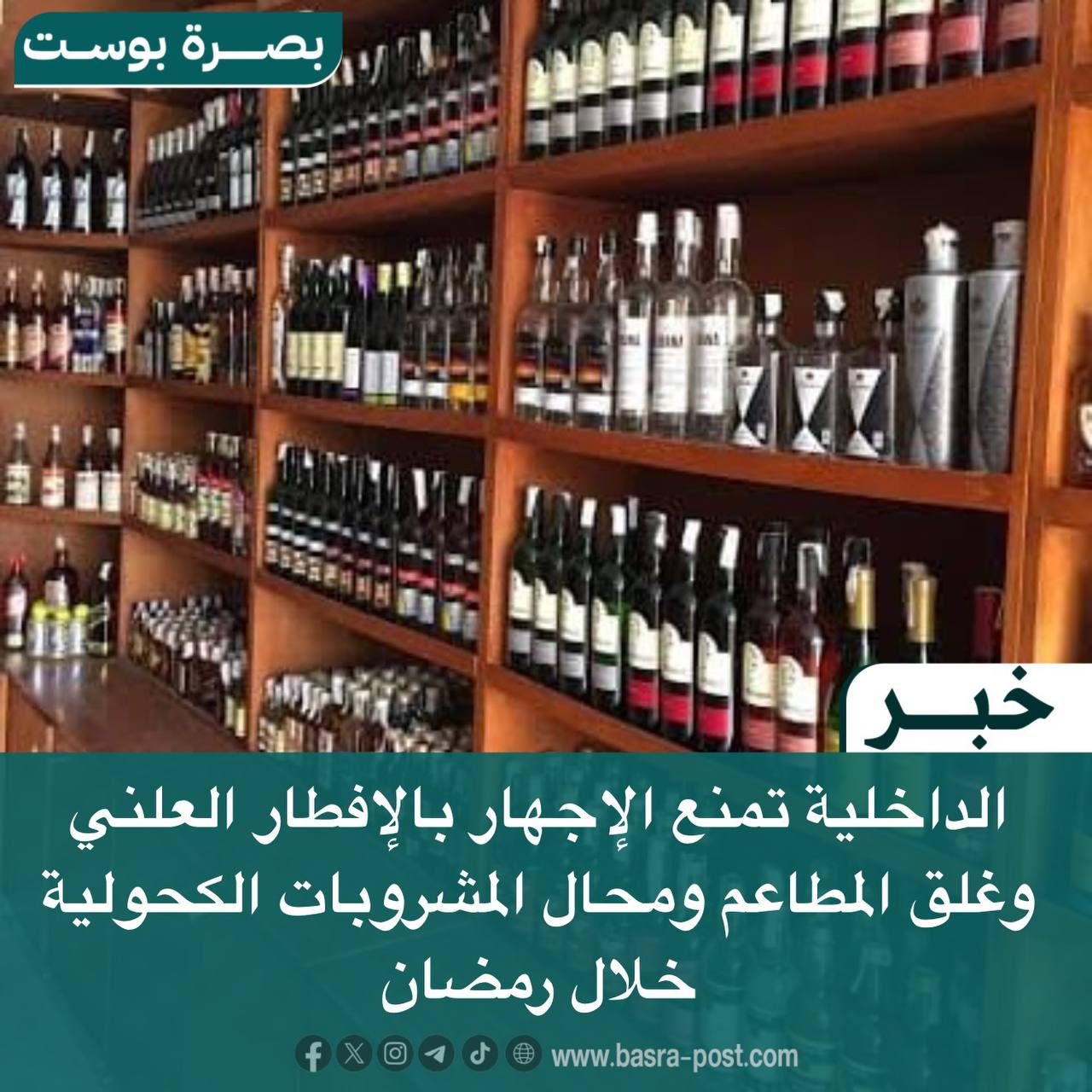 #وكالة_بصرة_بوست_الاعلامية أعلنت وزارة الداخلية، منع الإجهار بالإفطار العلني خلال ساعات الصيام، مؤكدة أن هذا الإجراء يأتي احتراماً لمشاعر الصائمين وصوناً لحرمة شهر رمضان المبارك، ويشمل الجميع دون استثناء من المواطنين والمقيمين في العراق، ترسيخاً لمبدأ الاحترام المتبادل بين مكونات المجتمع. وقال وزير الداخلية عبد الأمير الشمري إن الوزارة قررت منع تقديم أو تداول المشروبات الكحولية بجميع أنواعها طوال شهر رمضان، مع الاستمرار بغلق المخازن الخاصة بها. وأضاف أن الإجراءات تتضمن أيضاً غلق المطاعم والكافيهات والمقاهي والنوادي الاجتماعية في الفنادق والمحال التي تقدم المأكولات والمشروبات خلال أوقات الصيام، باستثناء الأماكن المجازة أصولياً من الجهات المختصة، مع التأكيد على متابعة الالتزام بالتعليمات واتخاذ الإجراءات القانونية بحق المخالفين.